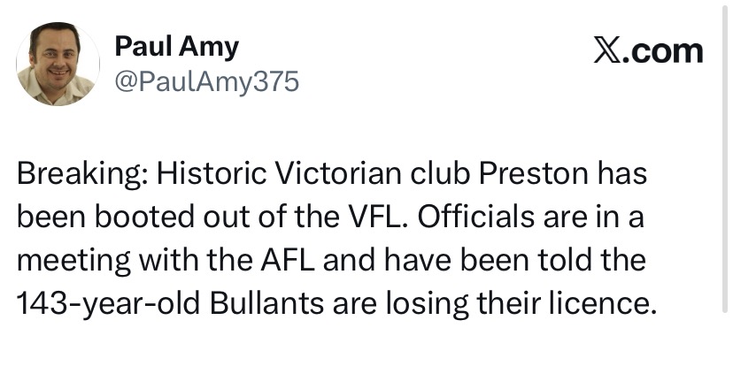 Terrible news. The woke afl would rather spend millions on garbage like snoop dog. They also pump millions to aflw and not one cent to clubs like Preston. Very sad to see a 143 year old club go like this. I went to their last ever win against Williamstown. Listened to their club song after the game. I'm hoping for a miracle but unlike Frankston due to their location will be much tougher.