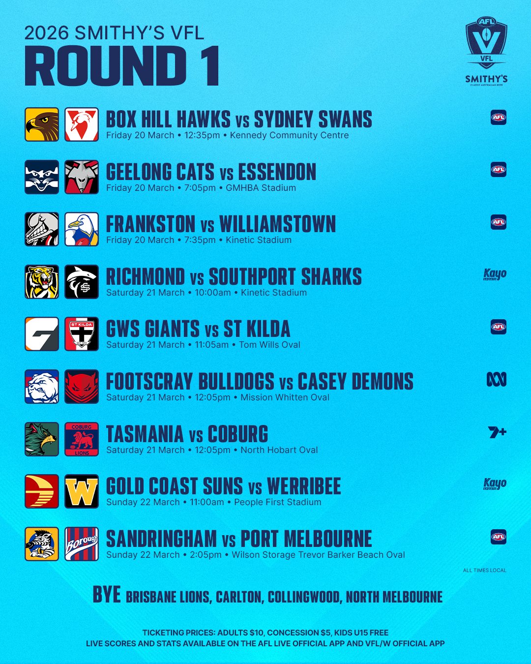 The season has arrived . All games are live on AFL App and Kayo Sports games will be live on Fox Footy, Richmond vs Southport game at Frankston will be Free Entry.